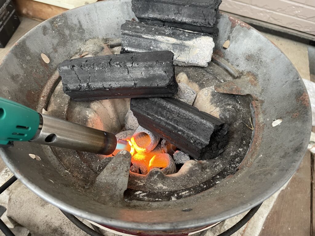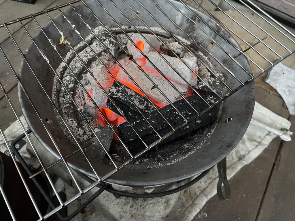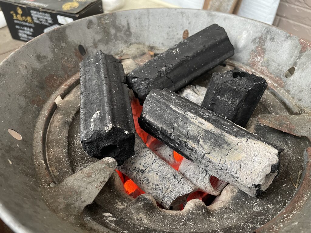 誰でもすぐに入手できる、一般的な丸型の七輪に、いつも使っているオガ炭をたっぷりと仕込んで焼きます。