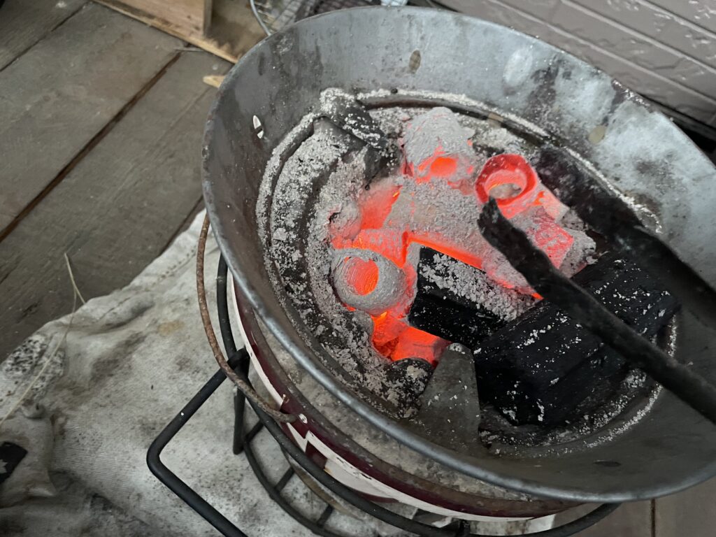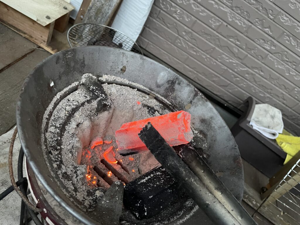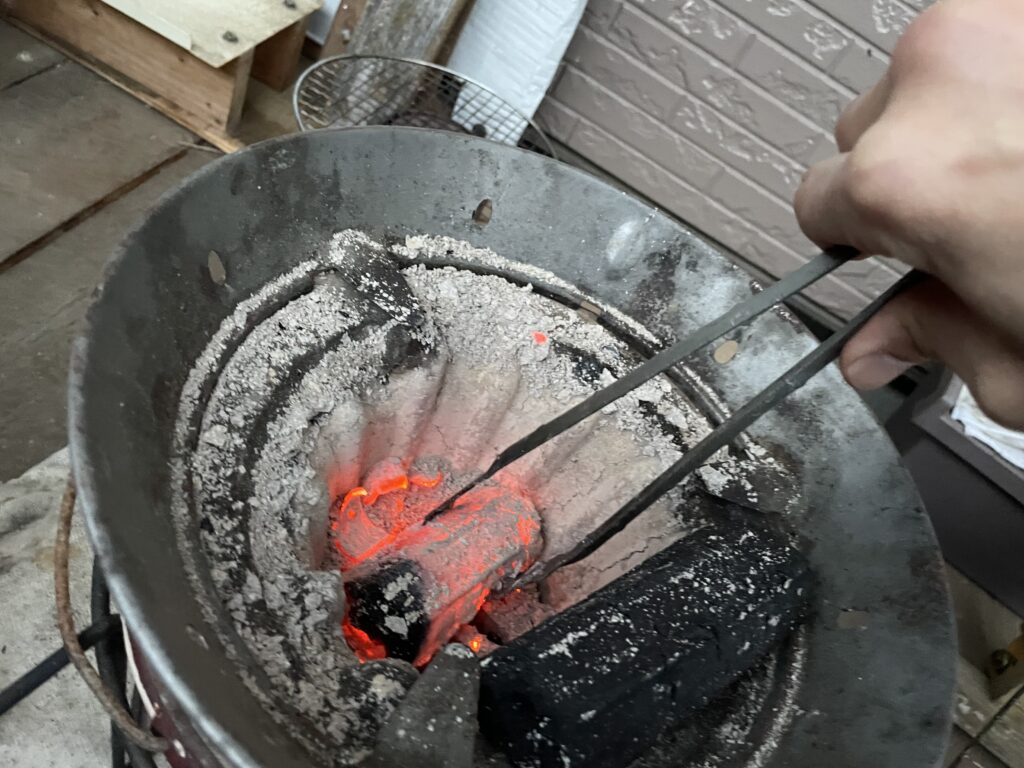 熱々のオガ炭を火ばさみで掴みます。