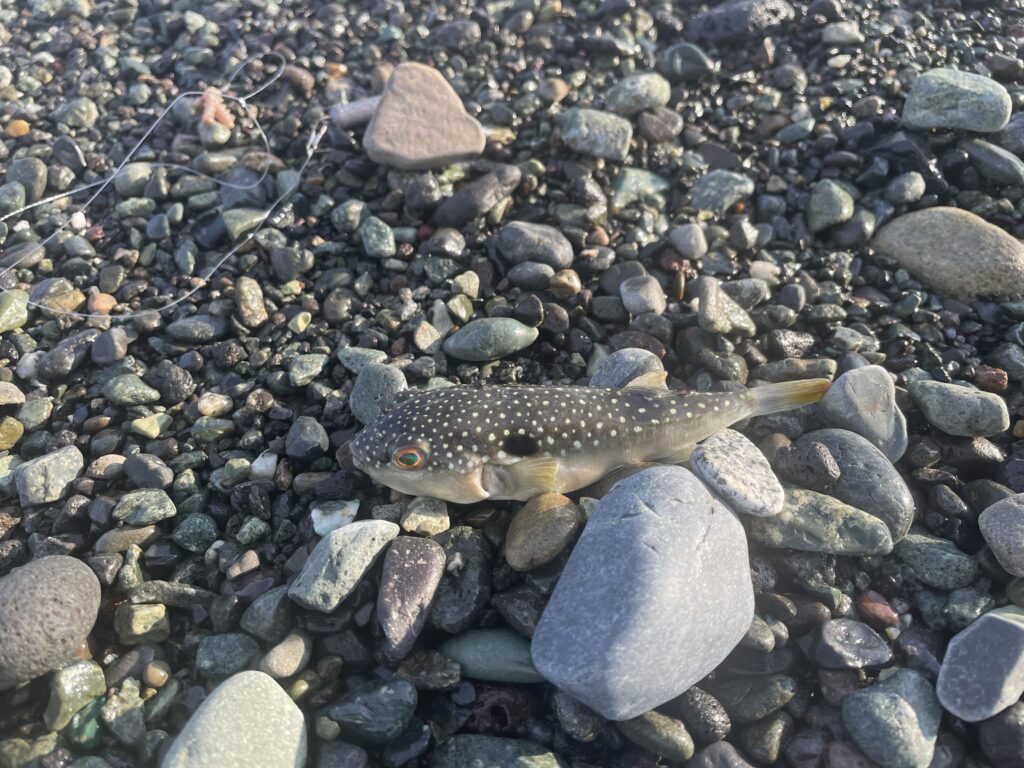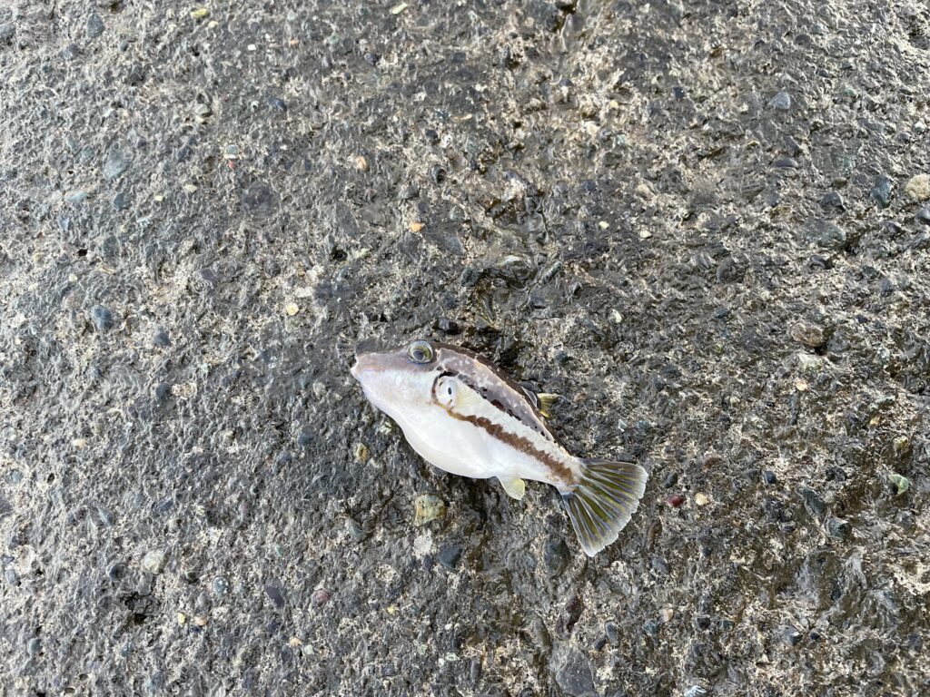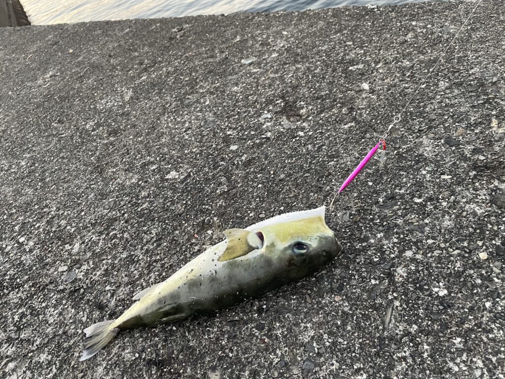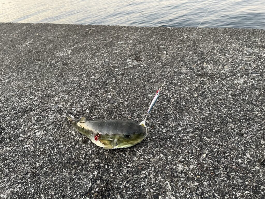一生懸命リールを巻きあげるのですが、魚が見える前から”シロサバフグだな…、これ…”ってわかっちゃって、悔しい。